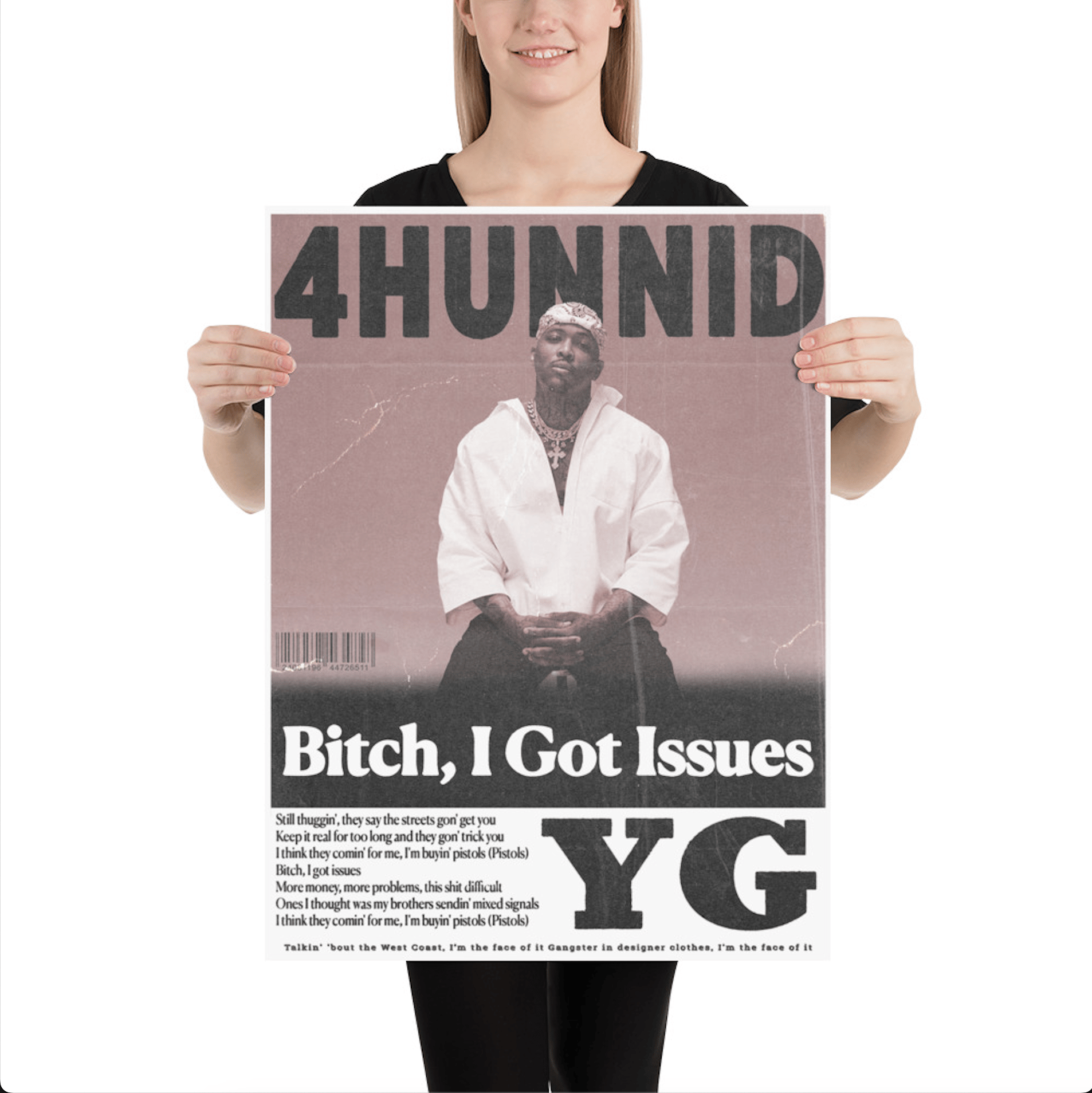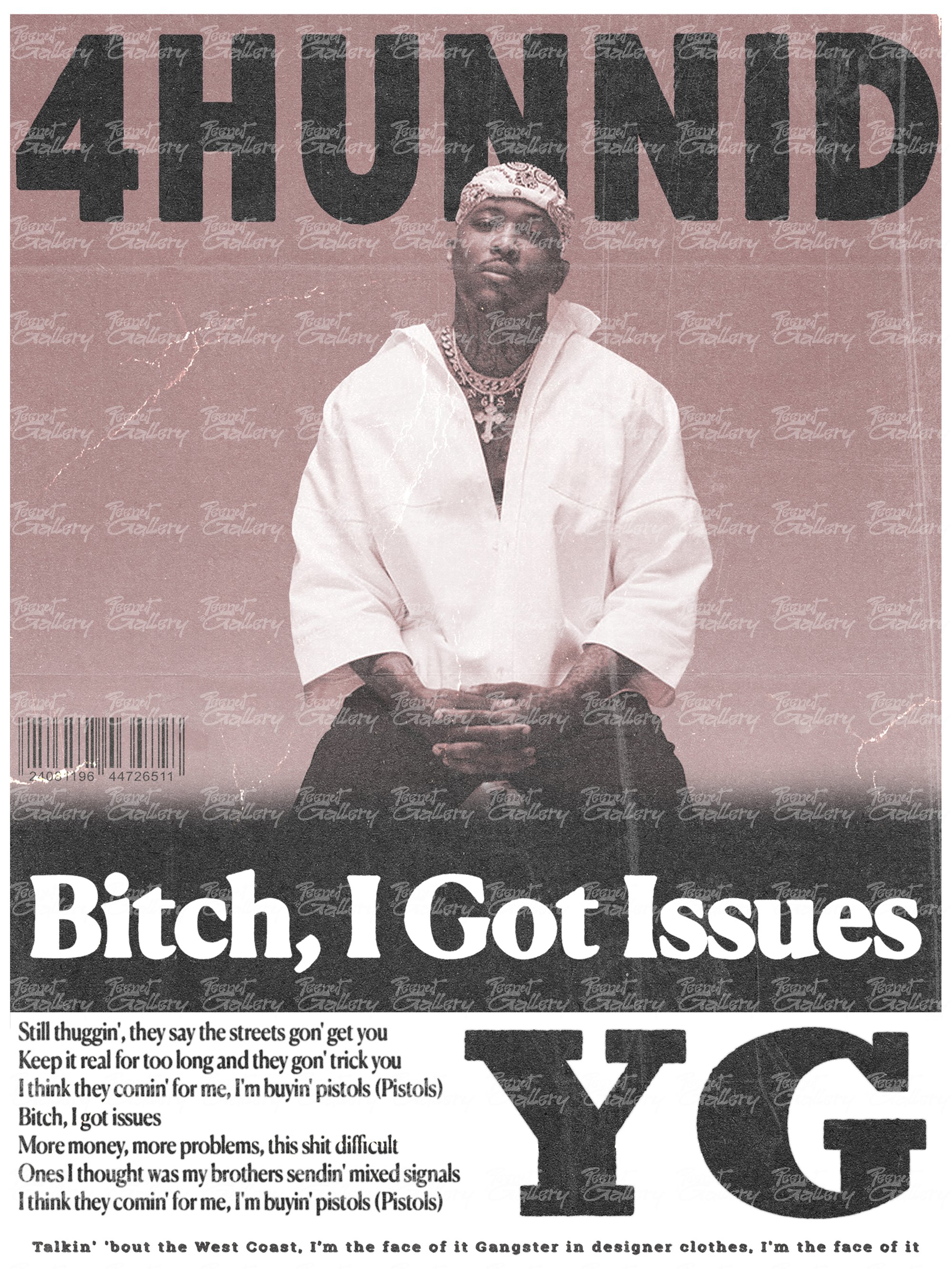 I GOT ISSUES is inspired by Hip Hop icon YG's 2022 album "I GOT ISSUES" The purpose of this piece is to celebrate a staple in the Hip Hop community while being displayed in your home or studio